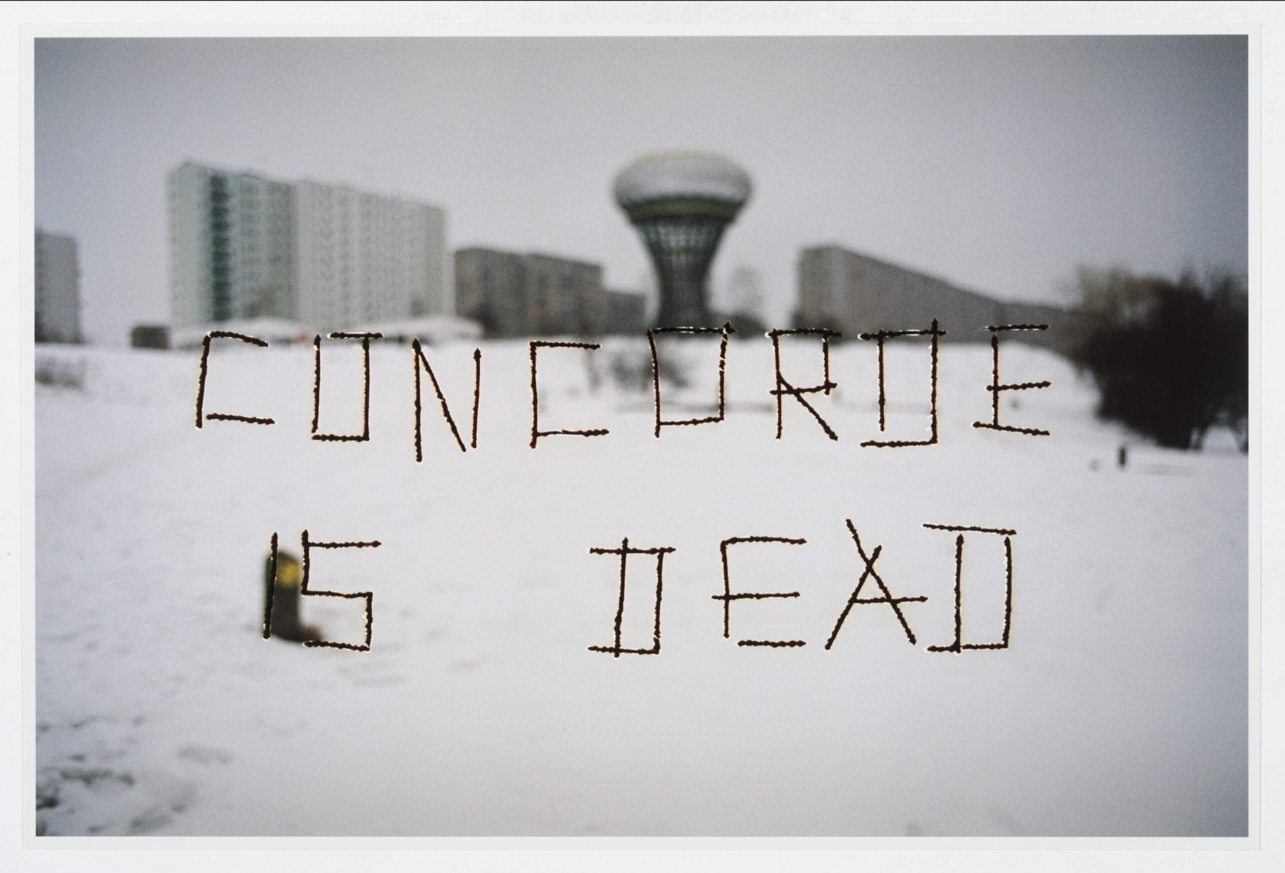 本作は「Parkett no.70」のために制作された「カラー・コンタクトプリント」です。すなわち、作家が写真ネガの表層を直接“刻む”ことで「Concorde is Dead」というテキストを生じさせ、そのネガをカラーペーパー(Kodak)にコンタクトプリントしたもの。素材としてはカラー出力でありつつ、視覚的には抑制されたトーンが選ばれています。文字は屋外の地面に刻まれたのではなく、写真ネガの表面に刻まれたものがプリントで可視化されています。サスナルは「現実の光景」と「写真という物質」のあいだを往還しつつ、テキストとイメージの緊張関係を成立させています。